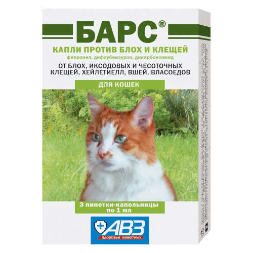 БАРС® капли против блох и клещей для кошек в качестве действующих веществ содержат фипронил – 10 мг/мл, дифлубензурон – 1 мг/мл и дикарбоксимид (МГК-264) – 1 мг/мл, а также вспомогательные вещества.